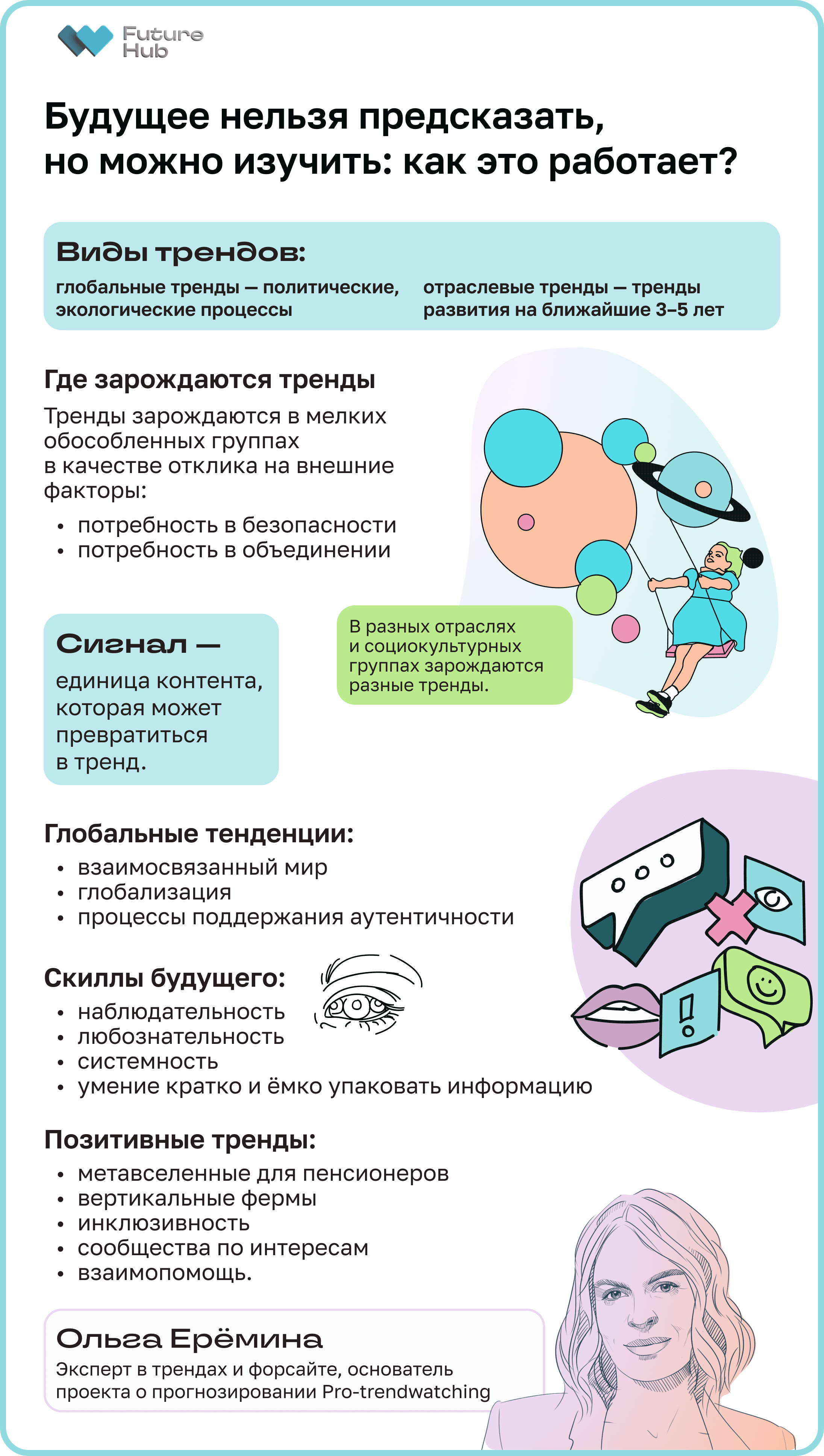 Их горизонт мышления — 2071 год, а Дубай в этом будущем — лучший город мира. | | | | | Это Dubai Future Foundation — первый в мире музей будущего | Команда музея популяризирует идеологию форсайта, вовлекая все новых игроков. Результаты страны за последние 20 лет — это явный результат следования выбранному сценарию будущего. | | | | | Технологии форсайта легко переложить на практику обычной жизни, сделав будущее более предсказуемым | Технологии форсайта не остаются ограниченными государственными стратегиями. Они легко переносятся в повседневную жизнь. Научитесь видеть тренды и использовать их в свою пользу! Этот навык и станет вашим конкурентным преимуществом в быстро меняющемся мире.Послушайте подкаст «Будущее нельзя предсказать, но можно изучать: как это работает?» с экспертом в изучении трендов и форсайте, основателем проекта о прогнозировании Pro-trendwatching. Вы поймёте:- В чём разница между планированием и проектированием будущего