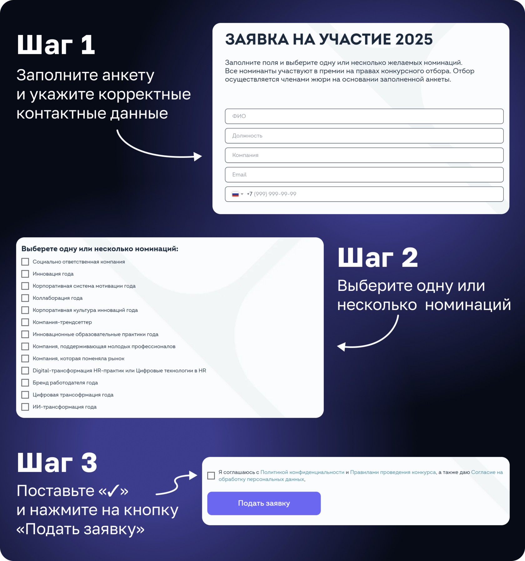 ЧТО ПРОИЗОЙДЁТ ДАЛЬШЕ?После отправки заявки с вами свяжется команда Премии. Вы получите расширенную анкету участника — её нужно будет заполнить и оплатить стоимость участия. Команда поможет на каждом этапе, если у вас будут вопросы.