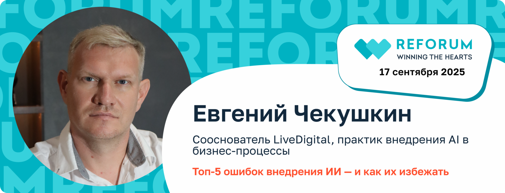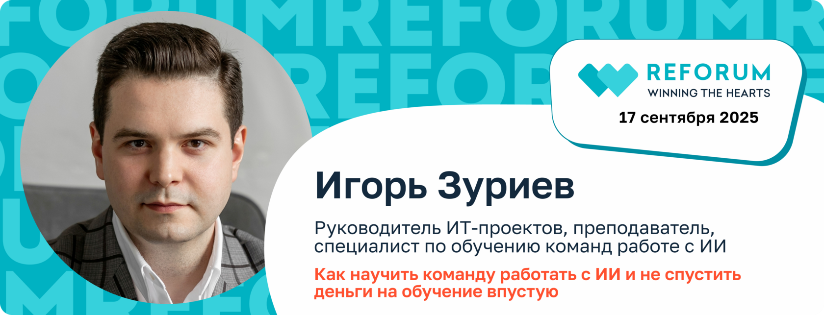 REFORUM AI Игорь расскажет, почему обучение ИИ‑инструментам часто не даёт возврата инвестиций — и как это изменить. Вы узнаете, как выстроить обучение под разные роли в компании, чтобы каждый получал нужные навыки: от стратегического понимания для топ‑менеджеров до прикладной пользы для специалистов.