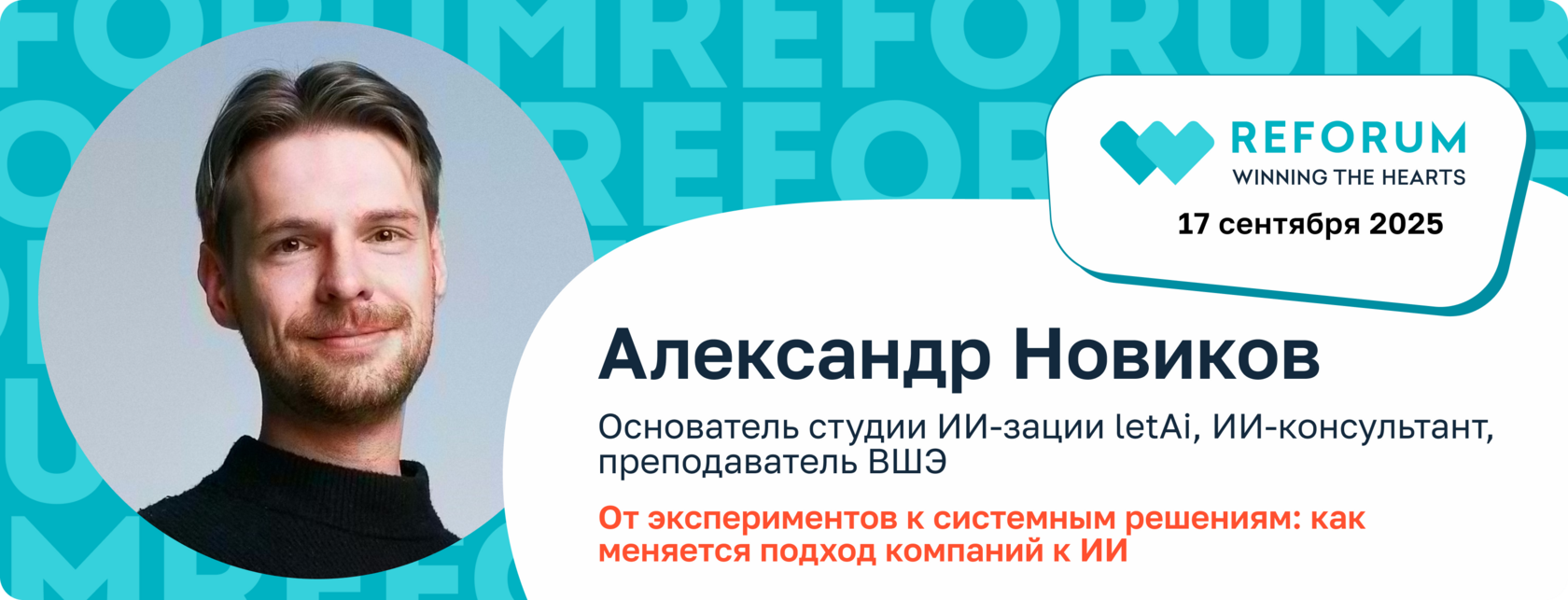 REFORUM AI Александр расскажет, как компании прошли путь от экспериментальных внедрений к системным решениям, и как менялся их подход. На примерах реальных кейсов и ошибок поделится, что действительно работает в ИИ-бизнесе, а что — нет. Вы услышите о текущем состоянии «кривой хайпа» и узнаете, где бизнес находится сейчас, а также о перспективах развития.