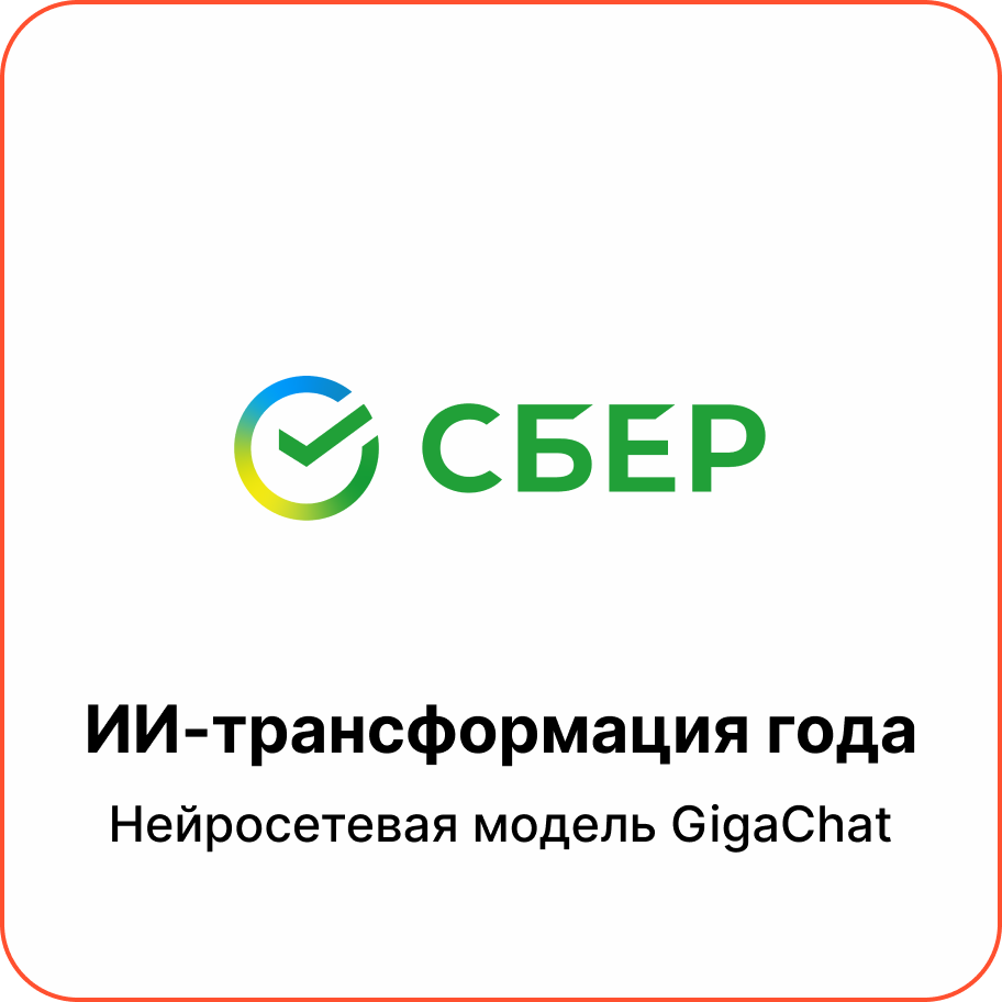 Сейчас более 5,4 млн переводов ежемесячно совершаются с полностью предзаполненными данными. Проект демонстрирует, как глубокая интеграция ML переосмысливает клиентский опыт, предугадывая потребности пользователя. Успех обеспечен тесным сотрудничеством бизнес- и ML-команд и использованием отечественного технологического стека. | | | | | | Участник премии REFORUM Awards 2025 в номинации ИИ-трансформация года — «Нейросетевая модель GigaChat» | | GigaChat — российская нейросетевая модель от Сбера, предназначенная для эффективного решения бизнес-задач. Сервис позволяет оптимизировать обработку текстов, проводить глубокий анализ больших объемов данных, создавать качественный контент, автоматизировать рутинные операции и повышать качество обслуживания клиентов.