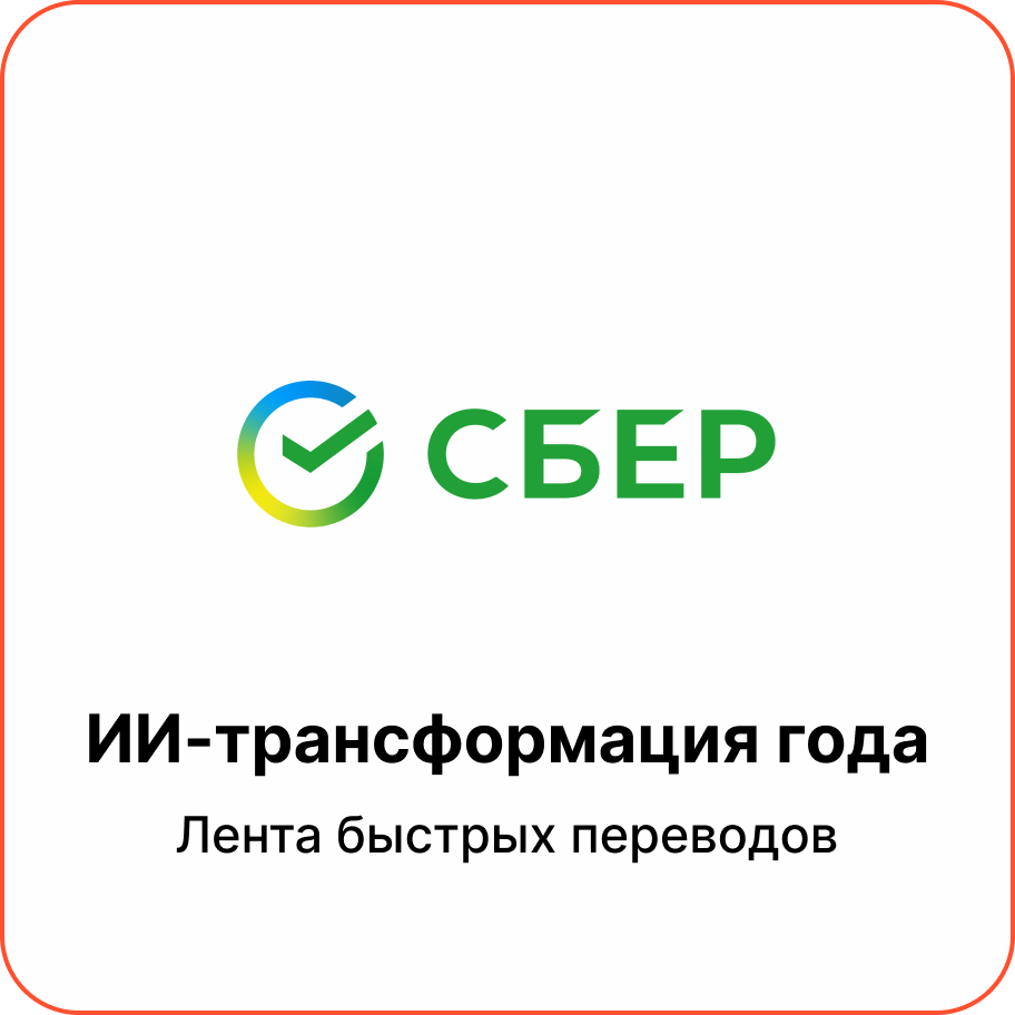 Узнайте их истории и станьте частью движения за инновации. | | | | Участник премии REFORUM Awards 2025 в номинации ИИ-трансформация года — «Лента быстрых переводов по номеру телефона с предсказанием релевантного получателя, способа перевода, банка и суммы перевода» | | Проект «Лента быстрых переводов по номеру телефона с предсказанием релевантного получателя, способа перевода, банка и суммы перевода» обслуживает около 75 млн клиентов ежемесячно, обеспечивая 80% успешных переводов. Для клиентов сервис ускоряет и упрощает переводы благодаря персонализации, а для банка — повышает конверсию и лояльность, снижая риски отказа.
